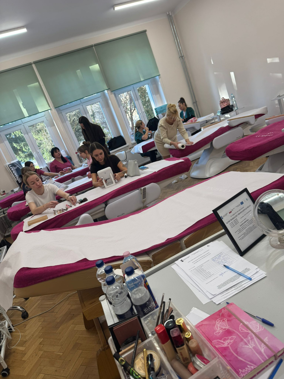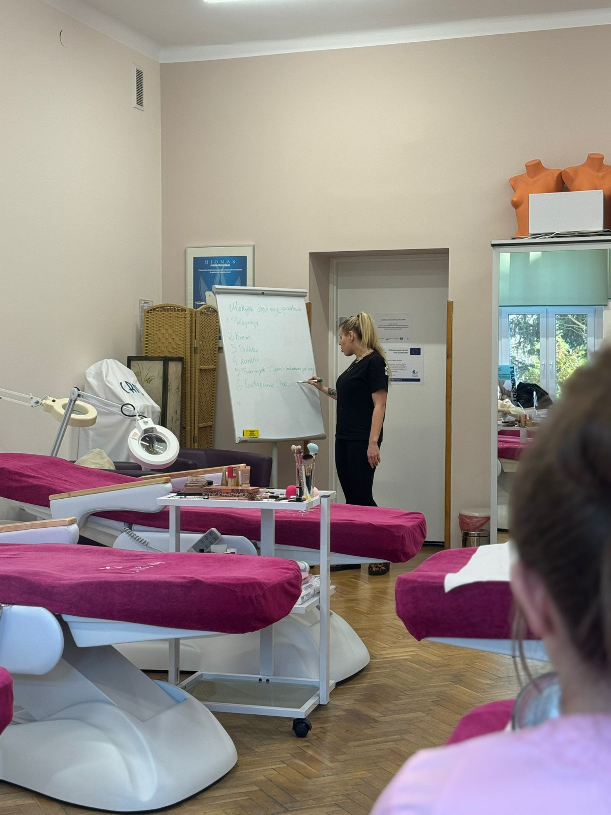 W Szkole Policealnej im. Jadwigi Romanowskiej w Elblągu rozpoczęła się I tura 30-godzinnego Kursu Makijażu Profesjonalnego, realizowanego dla słuchaczek kierunku Technik Usług Kosmetycznych w ramach projektu „Dajemy Skrzydła”. Celem szkolenia jest rozwijanie umiejętności praktycznych, poszerzenie kwalifikacji zawodowych oraz nabycie kompetencji niezbędnych w pracy wizażysty. Uczestniczki poznały podstawy profesjonalnego warsztatu, zasady higieny pracy, analizę rodzaju cery, teorię koloru oraz techniki konturowania twarzy. Szkolenie obejmuje również wykonanie pełnego makijażu profesjonalnego oraz praktyczne ćwiczenia pod okiem instruktora. Zajęcia stanowią ważny element przygotowania słuchaczek do pracy w branży kosmetycznej, zwiększając ich kompetencje oraz konkurencyjność na rynku. Projekt realizowany jest w ramach zadania: „Dajemy skrzydła – wyposażenie słuchaczy Szkoły Policealnej im. Jadwigi Romanowskiej w Elblągu w dodatkowe umiejętności zawodowe, poszerzenie posiadanych oraz zdobycie nowych kwalifikacji w obszarze kształcenia zawodowego” dofinansowanego z Programu Regionalnego Fundusze Europejskie dla Warmii i Mazur 2021-2027, Priorytet 6: Edukacja i kompetencje EFS+, współfinansowanego ze środków Europejskiego Funduszu Społecznego Plus. Beneficjentem projektu jest Województwo Warmińsko-Mazurskie.