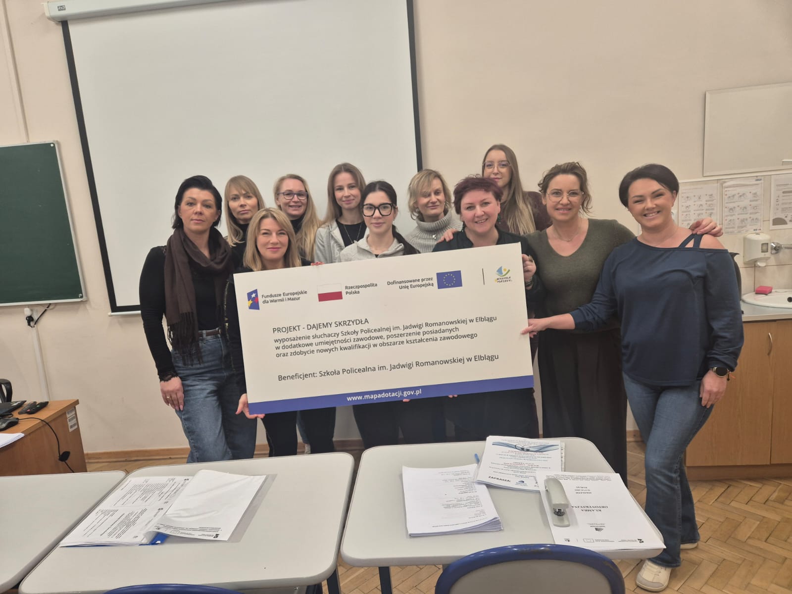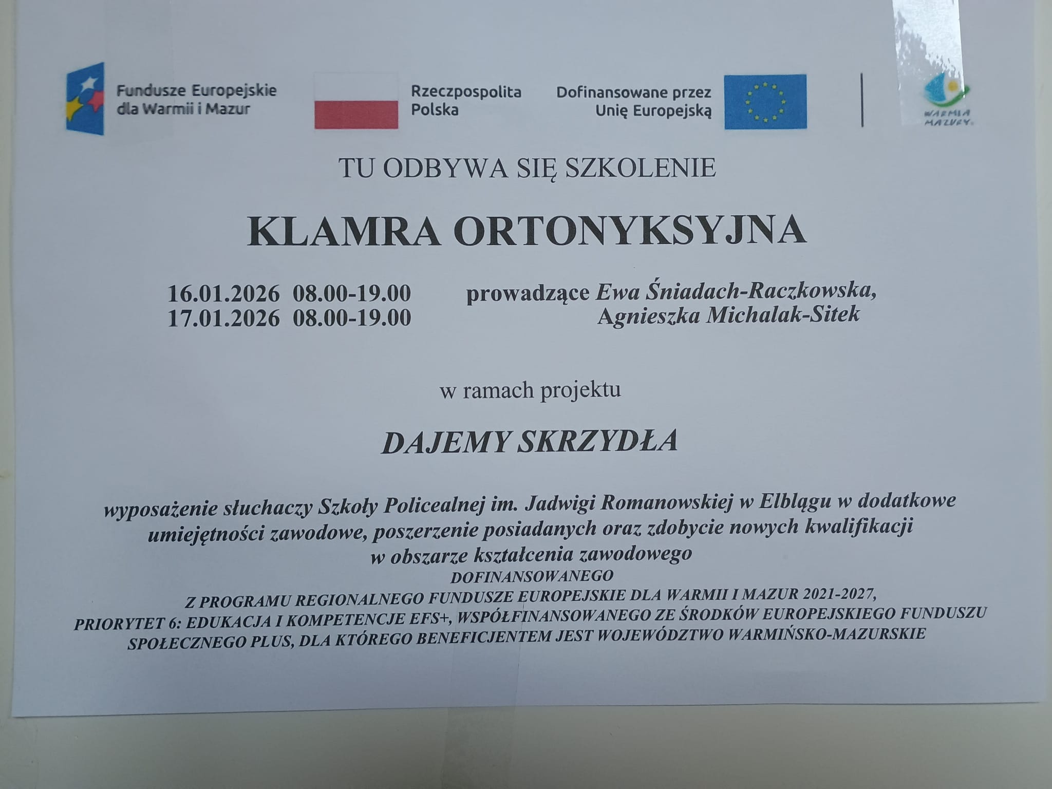 W ramach projektu „Dajemy skrzydła – wyposażenie słuchaczy Szkoły Policealnej im. Jadwigi Romanowskiej w Elblągu w dodatkowe umiejętności zawodowe, poszerzenie posiadanych oraz zdobycie nowych kwalifikacji w obszarze kształcenia zawodowego”, dofinansowanego z Programu Regionalnego Fundusze Europejskie dla Warmii i Mazur 2021–2027, Priorytet 6: Edukacja i kompetencje EFS+, 23.11.2025 odbyła się pierwsza część szkolenia zawodowego skierowanego do słuchaczy szkoły. Głównym celem szkolenia było rozwinięcie kompetencji osobistych i społecznych słuchaczy, zwiększenie ich samoświadomości oraz przygotowanie do bardziej świadomego i skutecznego funkcjonowania w środowisku zawodowym. Uczestnicy pracowali nad umiejętnościami komunikacyjnymi, radzeniem sobie ze stresem, wyznaczaniem celów oraz odkrywaniem własnych zasobów.