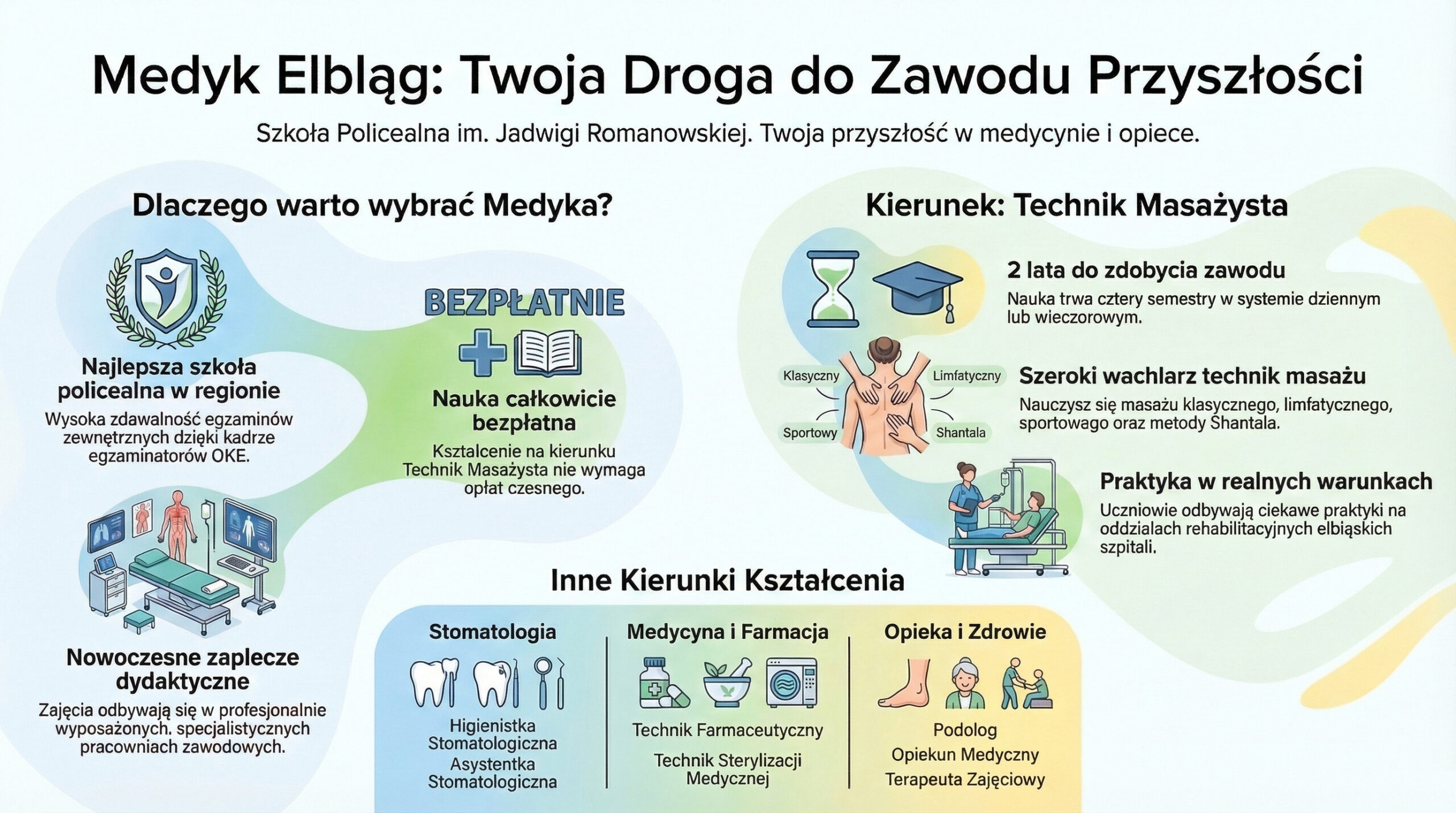 Kierunek Technik Masażysta w Szkole Policealnej im. Jadwigi Romanowskiej w Elblągu (znanej również jako „Medyk”) to propozycja dla osób dorosłych, które chcą zdobyć konkretny, regulowany prawnie zawód medyczny. Kształcenie trwa 2 lata i jest całkowicie bezpłatne.